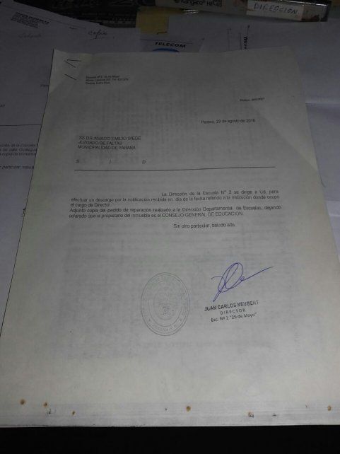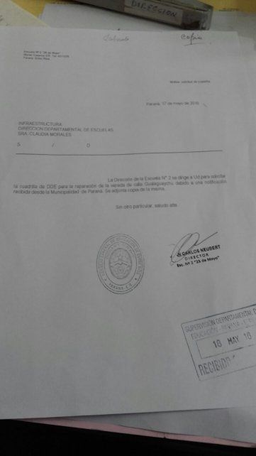 Continúa Puntel: "De todos modos, Neubert hizo lo que todo director de escuela sabe que debe hacer. El 18 de mayo envió la nota a la Dirección Departamental de Escuelas para solicitar la reparación de la vereda sobre calle Gualeguaychú y adjuntó una copia del acta de notificación".