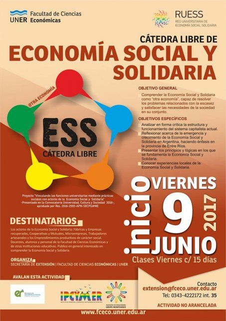 El viernes 9 de junio, a las 16, en el aula B14 se lanza la Cátedra libre de Economía Social y Solidaria en nuestra Facultad. El objetivo es comprender la Economía Social y Solidaria como "otra economía", capaz de resolver los problemas relacionados con la escasez y satisfacer las necesidades de la sociedad en su conjunto.