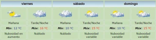 El viernes, sábado y domingo persistirá la nubosidad que será variable pero sin lluvia. La temperatura se mantendrá en el orden de los 11° la mínima promedio y en 15° la máxima promedio.