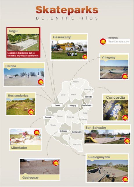 En Concordia, el ahora gobernador de Entre Ríos, Gustavo Bordet, cortó la cinta del skatepark que se inunda cada vez que sube el río Uruguay. Si bien estaba previsto en los planos, los skaters son los que tienen que limpiar el barro y la infraestructura se va dañando con la humedad.