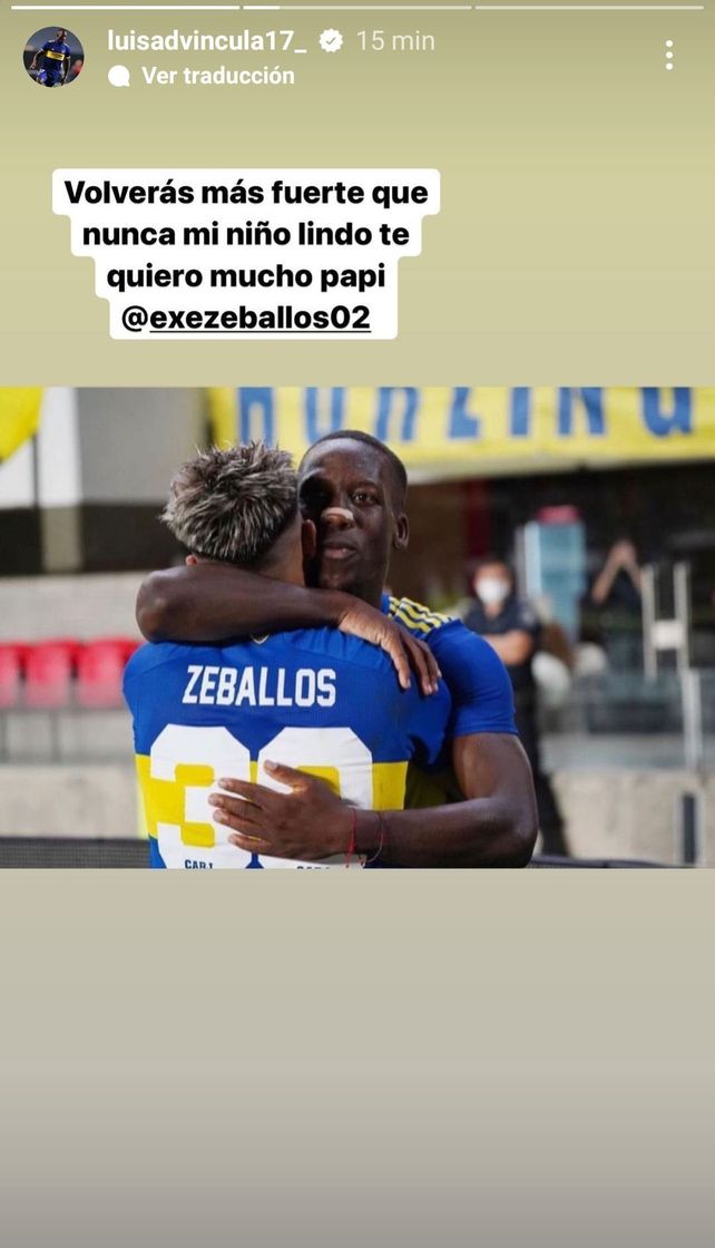 El delantero de Boca Juniors Exequiel Zeballos podría tener una severa lesión en la tibia derecha a raíz de la violenta infracción que le cometió el defensor de Agropecuario Milton Leyendeker en los primeros minutos del encuentro de octavos de final por Copa Argentina que los "xeneizes" ganaron anoche en Salta por 1 a 0. El defensor Peruano, Luis Advíncula escribió una paternal historia en su cuenta de Instagram.