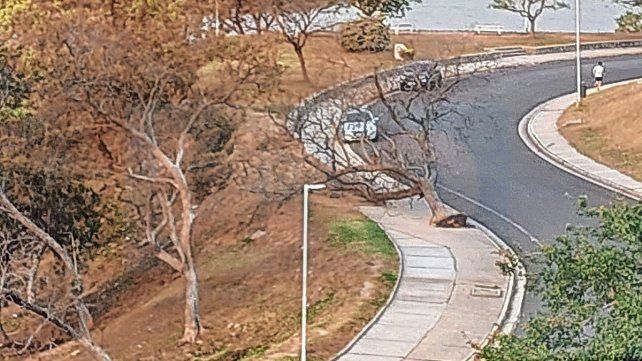 Otro punto de conflicto a causa de las fuertes ráfagas de vientos, se dio en la zona del parque Urquiza, en el Patito Sirirí, donde otro pesado y añejo árbol cayó sobre la cinta asfáltica, dañando una parte de un vehículo.
