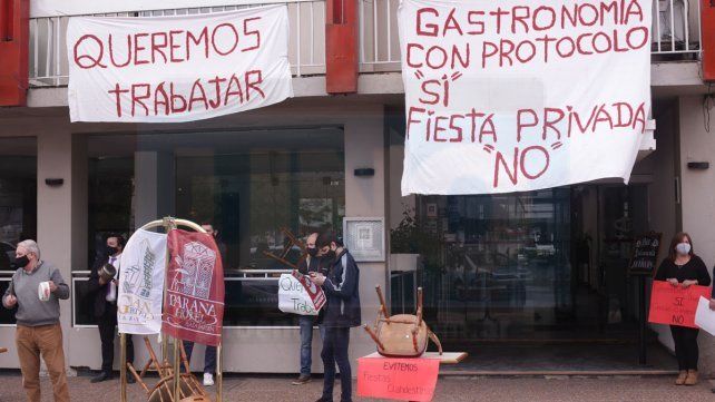 Gastronómicos y hoteleros protestaron en pleno centro de Paraná por las restricciones al rubro impuestas por autoridades municipales y provinciales ante la cuarentena del Coronavirus Covid-19. Dan cuenta de la acuciante situación económica y laboral del sector y piden la rehabilitación de las actividades, prohibidas al retroceder Paraná a la Fase 3 debido al aumento exponencial de casos que este miércoles alcanzan los 190 positivos de los cuales 148 se confirmaron en el departamentos Paraná.