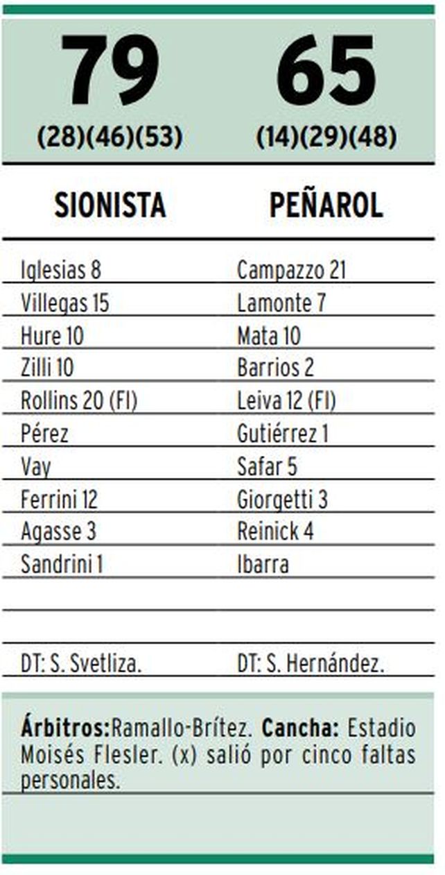 Aquel equipo de Sionista tenía a los nacionales Daniel Hure, Alejandro Zilli, Ramiro Iglesias, Fabricio Vay, Federico Ferrini, Nicolás Agasse y Jeremías Sandrini. Los extranjeros que jugaron en aquel equipo fueron Johwen Villegas y Hakeem Rollins, quien ese partido ante Peñarol se transformó en el mejor jugador del elenco de Paraná. Terminó con 20 puntos y 11 rebotes.