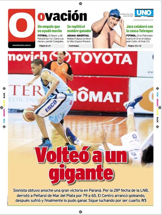 La tapa de Ovación era muy elocuente: “Volteó a un gigante” indicaba el título y la foto del reportero gráfico Diego Arias captaba el momento en el que el base argentino estaba en el suelo (Ver portada).