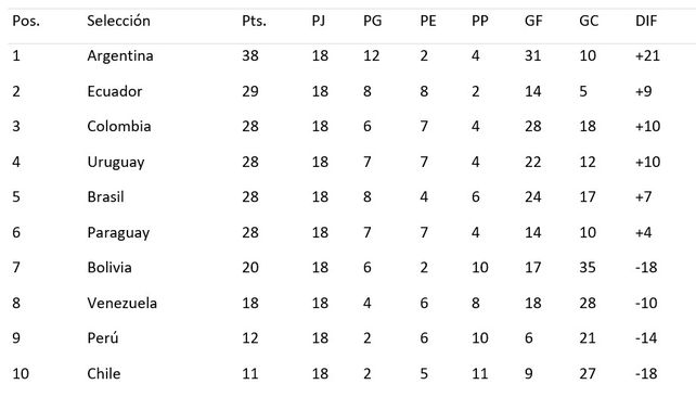 Es importante tomar en cuenta que los primeros 6 clasificados de la tabla de posiciones, avanzaron directamente a la Copa Mundial de 2026. Mientras que el 7mo puesto, o sea Bolivia, tendrá que jugar un repechaje.