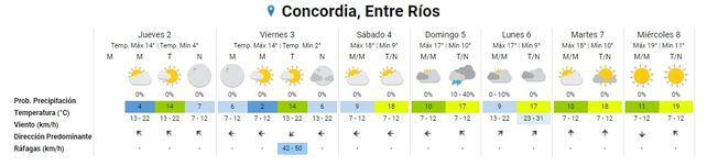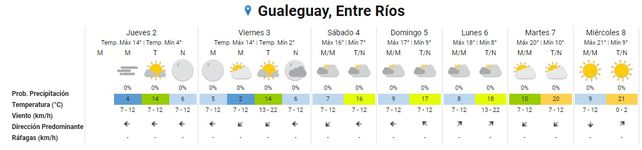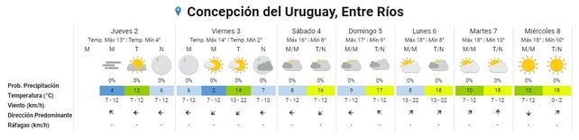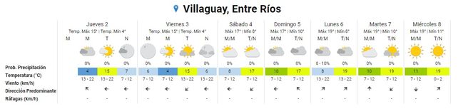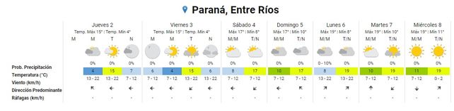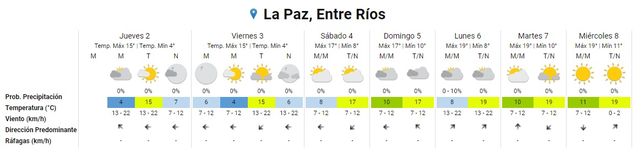 La semana que viene se espera la misma continuidad de suba, leve, de las temperaturas. El lunes, que estará nuevamente nublado, se proyecta una mínima de 8° y una máxima de 19°, con algo más de vientos, de entre 13 y 22 kilómetros por hora, provenientes ahora del sudoeste.