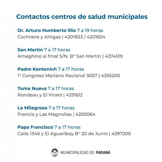 *Centro de Salud Toma Nueva: 7 a 17 horas, dirección: Rondeau y El Viraró. Teléfono: 4331612.