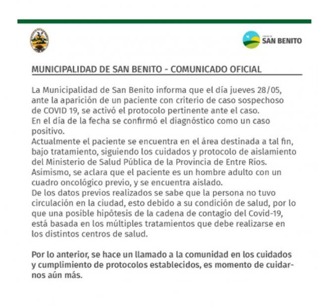 La Municipalidad de San Benito confirmó este jueves que "ante la aparición de un paciente con criterio de caso sospechoso de COVID 19, se activó el protocolo pertinente ante el caso". "En el día de la fecha se confirmó el diagnóstico como un caso positivo", agrega el comunicado.