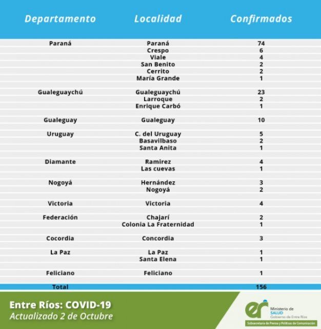 Coronavirus en Entre Ríos: 156 nuevos casos, 89 en Paraná