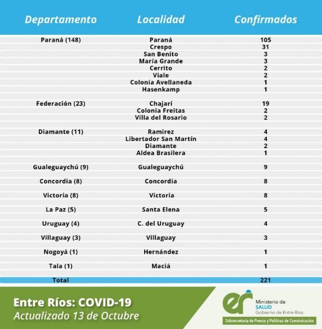 Coronavirus en Entre Ríos: 221 nuevos casos, 148 en Paraná