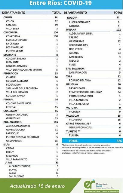 En virtud de los datos reportados al viernes 15 de enero de 2021 por el área de Vigilancia Epidemiológica del Ministerio de Salud, en Entre Ríos se han sumado 586 casos de Coronavirus. De ese modo, en la provincia son 37.697 los confirmados.
