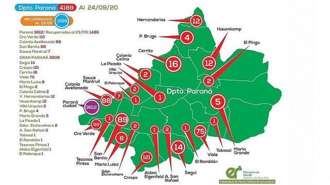 Se reclasifica un caso de Aldea María Luisa y se suma a la ciudad de Paraná. Asimismo, se resta un caso del Departamento Federación (Chajarí) sumándolo al Departamento Diamante (Libertador San Martín).