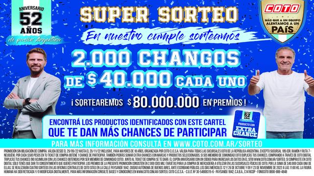 Desde el 29 de Septiembre hasta el 20 de Noviembre del 2022 inclusive, COTO festeja 52 años de pasión argentina con un gran Sorteo de 2.000 órdenes de compras de $40.000 c/u. Junto con este espectacular Sorteo, que sin dudas es “La jugada del año”, COTO lanza un nuevo spot que tiene como protagonista a una dupla muy popular en el mundo futbolero: el ex jugador campeón del mundo Oscar Ruggeri y el periodista deportivo Sebastián “El Pollo” Vignolo.