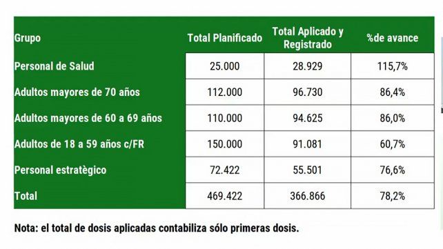 La provincia supero la s 569.000 personas que ya tienen alguna dosis aplicadas y registradas, según señaló Marcos Bachetti quien además anunció que se pueden anotar para recibir las vacunas los mayores de 18 años sin factores de riesgo. "Estamos llegando casi al 80% de la población objetivo a vacunar con su primera dosis inoculada". Hemos recibido más de 680.000 dosis de las tres vacunas que se están aplicando en la provincia (Sputnik V, AstraZeneca y Sinopharm). Mañana se recibirá un importante lote de vacunas chinas Sinopharm que se distribuirán la semana que viene. También se aumentó la vacunación en toda la provincia con 60.000 aplicaciones semanales", enumeró.