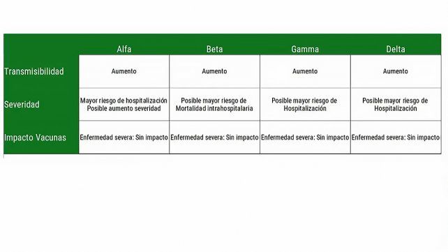 Todas estas variantes están presentes en Argentina por contagios de viajeros que han llegado desde el exterior. Solo las cepas Alfa y Gamma están en circulación comunitaria y predominan en el país desde la segunda ola. Hasta el momento, teniendo el esquema completo de vacunas, ninguna de las variantes afectaría su efectividad de inmunización. Todavía no hay estudios al respecto.