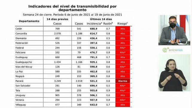 Sobre la situación epidemiológica de la semana 24, Garcilazo indicó que todos los departamentos de la provincia continúan en Alto riesgo, y Paraná en Alarma. No obstante la persistencia de “departamentos en rojo” y, en comparación con las cifras del periodo anterior -que va del 23 de mayo al 5 de junio- los casos de Coronavirus Covid-19 descendieron un 35% en todos los departamentos. "Es la tercera semana consecutiva con un descenso de casos", dijo Garcilazo aunque aclaró que la ocupación de camas en terapia intensiva sigue siendo elevada al igual que la cantidad de casos activos de coronavirus.