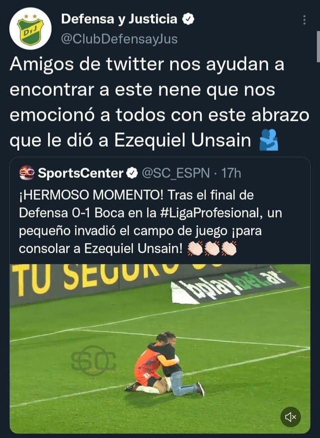 Justamente el niño ayudó a su ídolo a levantarse y a los pocos segundos llegó Nazareno Colombo que le dio una palmada a su compañero de plantel y otra al inesperado invasor que siguió caminando durante varios metros junto a los futbolistas. “Amigos de Twitter nos ayudan a encontrar a este nene que nos emocionó a todos con este abrazo que le dió a Ezequiel Unsain”, redactó la cuenta oficial de Defensa y Justicia. Automáticamente, los cibernautas de las redes sociales se encargaron de armar el contacto entre la familia del protagonista de la noche y el club.