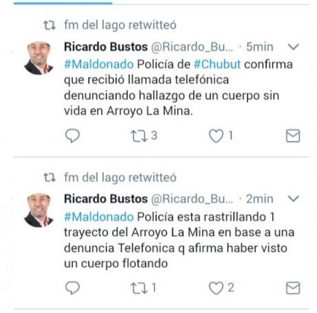 Según un retuit de FM Del Lago, de Esquel, la denuncia fue telefónica y anónima y el posteo original pertenece a Ricardo Bustos, dedicado a las Relaciones Públicas y Comunicación de una empresa minera.
