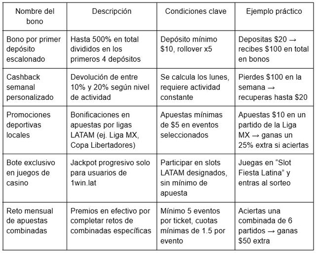 Lo más destacado de estas promociones es que no son genéricas. Cada una ha sido desarrollada teniendo en cuenta el comportamiento del usuario latino, con condiciones claras, requisitos accesibles y recompensas que realmente valen la pena. A continuación, te mostramos una tabla con los cinco bonos más exclusivos disponibles actualmente en 1win.lat, incluyendo ejemplos concretos y los requisitos para poder disfrutar de ellos al máximo.