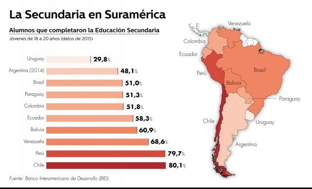 Según el sociólogo y especialista en jóvenes, Raúl Zarzuri, asegura que en Chile el 90% de los adolescentes culmina el secundario. Hoy en día, es el país con mayor porcentaje en este ámbito, al contrario de lo que sucede en Uruguay o Argentina , donde hay una gran deserción.