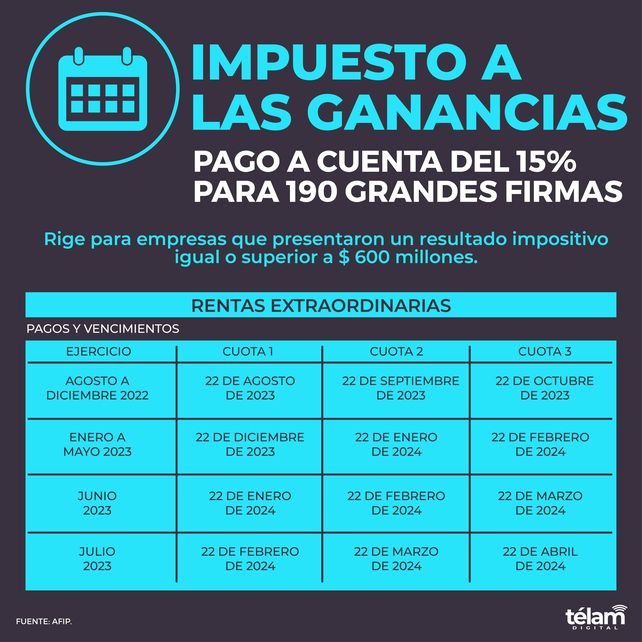 A diferencia del de este año, dicho anticipo era del 15% para las empresas con ganancias iguales o superiores a $ 100 millones, y del 25% para las de más de $ 300 millones.