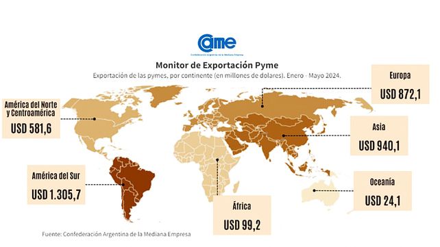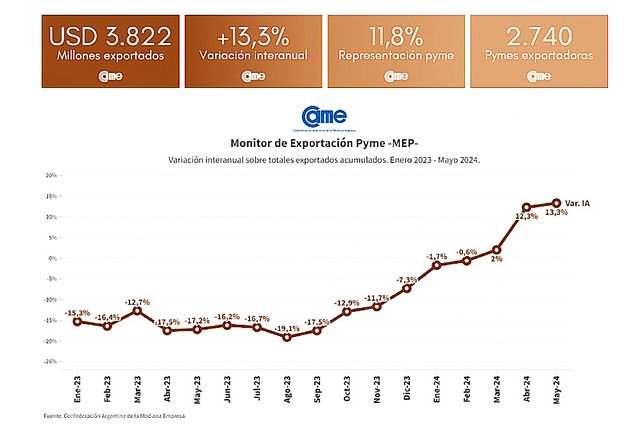 Durante los primeros cinco meses de 2024, las exportaciones de las pymes crecieron un 13,3% en dólares y 14,7% en toneladas, según datos de CAME. El mayor incremento en toneladas fue el de la industria textil