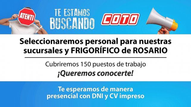 Si estás buscando trabajo, querés tener tu primera experiencia laboral o conocés a un familiar, amigo o conocido que puede estar interesado, COTO te espera para tener una entrevista presencial los días 11 y 12 de Julio de 8 a 16 hs. en su sucursal ubicada en Av. Junín y Thedy (Alto Rosario Shopping).
