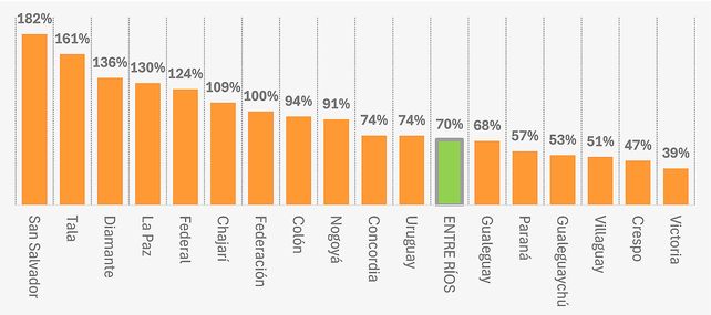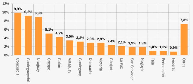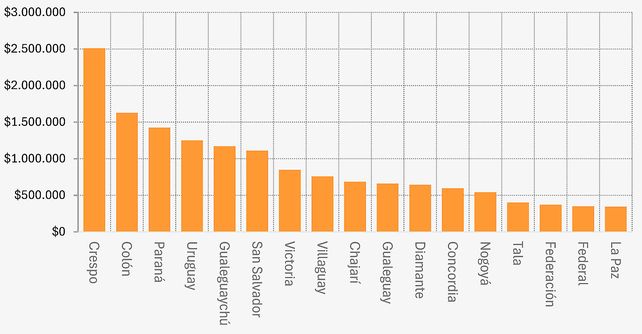 En el tercer y cuarto lugar aparecen Paraná ($1,42 millones) y Concepción del Uruguay ($1,29 millones), seguidas por Gualeguaychú ($1,16 millones), lo que confirma que las grandes ciudades concentran gran parte del financiamiento.