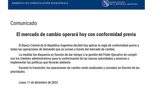 El BCRA decidió aplicar este lunes la regla de conformidad previa a todas las operaciones de demanda que se cursan a través del mercado de cambio. Esto es en el marco de la transición de cambio de presidente que lleva adelante el regulador monetario, tras la asunción de Javier Milei.