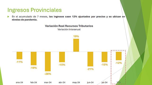 "La Provincia de Entre Ríos enfrenta una profunda caída en sus fuentes tributarias, apenas maquillada por el ingreso extraordinario del Impuesto a las Ganancias en mayo, que permitió cancelar el vencimiento del ERF25 de ago/24", indica un informe difundido por la Secretaría de Presupuesto y Finanzas del Ministerio de Economía provincialal que tuvo acceso UNO, tras una charla informal del gobernador Rogelio Frigerio con la prensa. "En paralelo, no se han recibido transferencias presupuestarias del Gobierno Nacional, entre ellas las destinadas a financiar el déficit de la CJPER, siendo el Tesoro Provincial quien debe suplir dicho recorte", continúa el reporte.