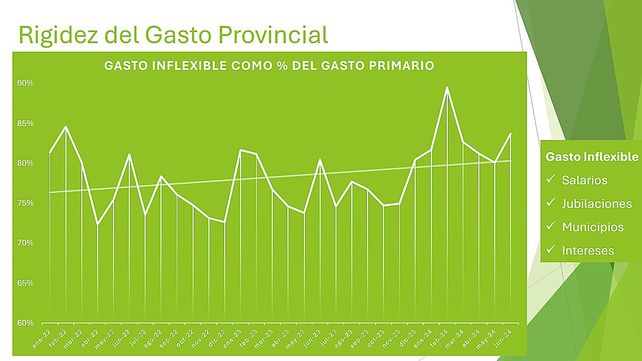 Pese al acotado margen de acción derivado de la rigidez de la estructura de erogaciones, las medidas sobre el gasto público y las reformas en la Caja Previsional permitieron evitar una crisis durante el primer semestre. "Sin observarse una mejora concreta en la dinámica del nivel de actividad y recursos, se comprime la previsión de disponibilidades al cierre de ejercicio y para 2025", concluye el informe en coincidencia con las palabras del gobernador sobre el virtual "cierre de grifo de recursos" por parte del Gobierno nacional.