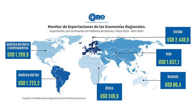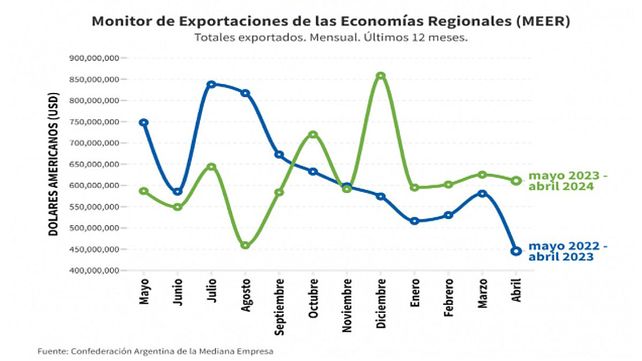 De acuerdo con el Monitor de Exportaciones de las Economías Regionales (MEER) elaborado por la Confederación Argentina de la Mediana Empresa (CAME), abril terminó con una caída en las exportaciones de las economías regionales del 1,5% en dólares, y con un crecimiento del 2,8% en toneladas, lo que representa una baja interanual de USD 113 millones en el total exportado y un aumento de 175 mil toneladas en el volumen comercializado.