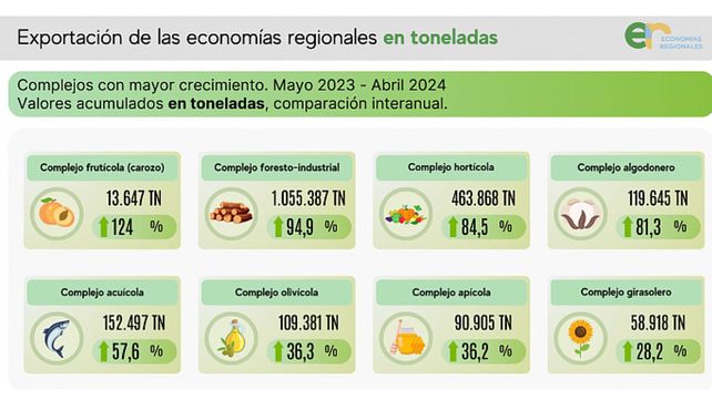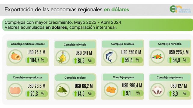 Con esta caída, las exportaciones regionales alcanzaron los USD 7.425 millones exportados en el período mayo 2023 – abril 2024, habiendo importado USD 961 millones, lo que arroja un superávit comercial de USD 6.464 millones.