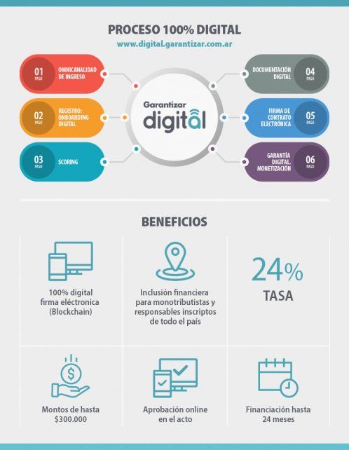 La novedosa plataforma Garantizar Digital permite a los pequeños comerciantes, trabajadores independientes y profesionales monotributistas y/o responsables inscriptos acceder a préstamos de hasta 300 mil pesos con una tasa del 24% a pagar en dos años. El proceso, tanto la solicitud como el otorgamiento, se realiza de manera íntegramente digital mediante la tecnología Blockchain.