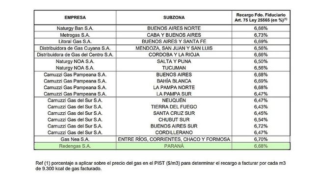 Este mes las tarifas del gas natural serán más caras tras la autorización del Gobierno nacional del aumento del precio para el punto de ingreso del fluido, a través de la Resolución 444/25 publicada en el Boletín Oficial de la Nación. Según el anexo de dicha resolución a Entre Ríos, a través de la empresa distribuidora Redengas SA le corresponde un incremento de 6,68% de recargo "del Fondo Fiduciario, según artículo 75 de la Ley N° 25.565 y su modificatoria Ley 27.637"