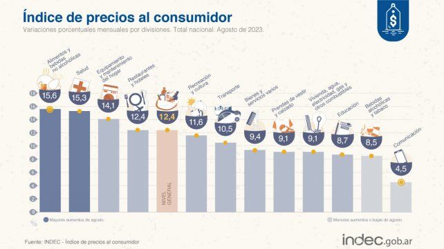 Según el relevamiento del INDEC, la división de mayor aumento en el mes fue Alimentos y bebidas no alcohólicas (15,6%), producto de la suba en Carnes y derivados y Verduras, tubérculos y legumbres. Le siguieron Salud (15,3%) –principalmente por los aumentos en medicamentos– y Equipamiento y mantenimiento del hogar (14,1%).
