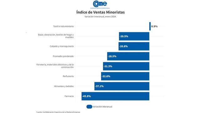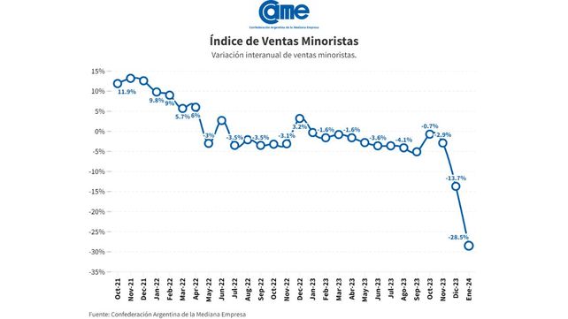 La caída del 28,5% surgió del Índice de Ventas Minoristas Pymes de CAME, elaborado en base a un relevamiento mensual entre 1.256 comercios minoristas del país, realizado del 1 y 2 de febrero de 2024.
