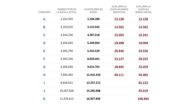 Para estar en la categoría más baja, la A, la facturación tiene que ser inferior a 2.108.288 pesos, mientras que los ingresos de la categoría más alta (la K) es de $ 16.957.968.