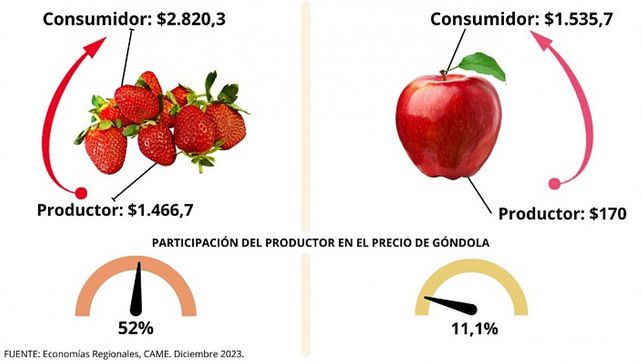 La manzana roja fue el alimento con mayor brecha entre el productor y el consumidor. Sus precios subieron tanto en origen (1,5%) como en destino (20%).