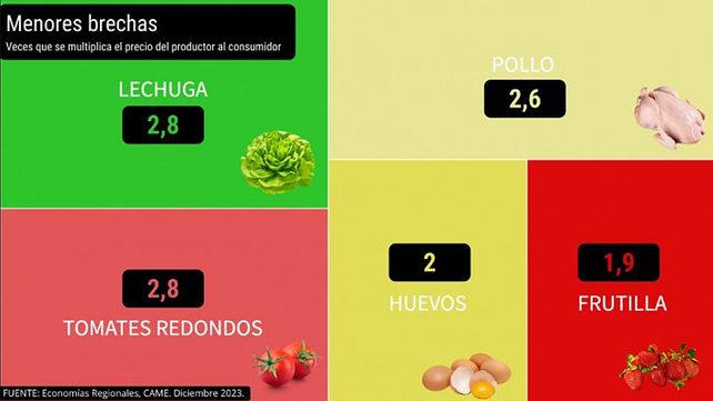 Entre los productos que presentaron menor diferencia entre el precio que recibió el productor y el que pagó el consumidor se encuentran cuatro frutihortícolas y uno de origen animal.
