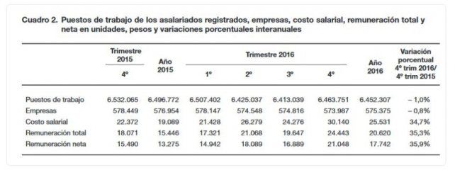 El costo salarial al cuarto trimestre de 2016 se ubicó en 30.140 pesos, un 34,7% más que en el mismo período de 2015. La remuneración de bolsillo se ubicó en 24.443 pesos con un alza de 35,3%. De acuerdo a estas cifras los salarios perdieron aproximadamente 6 puntos de poder adquisitivo contra una inflación que para 2016 se ubicó en el orden del 41%.
