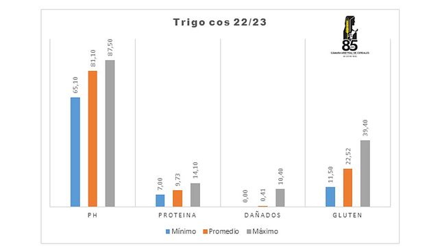 El contenido proteico promedio alcanza 9.73%, medio punto porcentual por debajo de la campaña 2021/2022, la cual estuvo en 10.25%. En cuanto al gluten arroja un valor promedio de 22.52%. El peso hectolítrico muestra un buen promedio, con 81.10 kg/hl, similar al del ciclo anterior, 80.58 kg/hl.