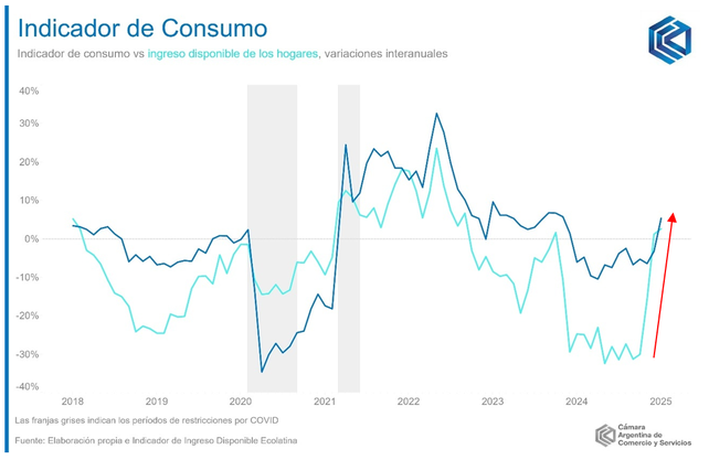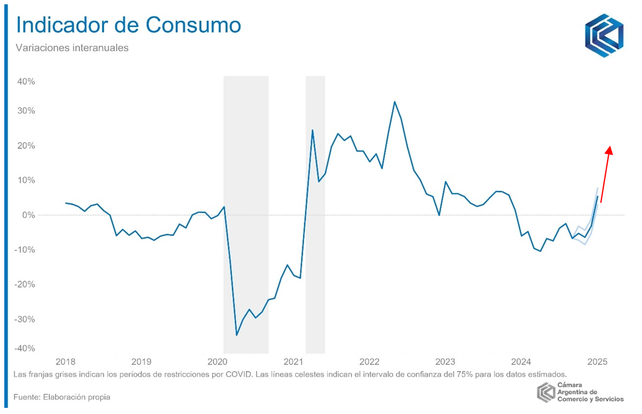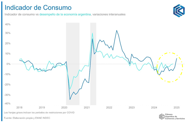 El Indicador de Consumo (IC) de la Cámara Argentina de Comercio y Servicios (CAC) mostró un avance de 5,4% en la comparación interanual en enero de 2025, implicando un crecimiento desestacionalizado de 4,3% frente al mes de diciembre (es decir, descontando los efectos estacionales habituales del consumo a lo largo del año).