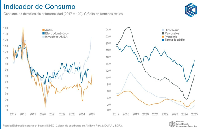Luego de hacer piso en abril de 2024, el crédito en términos reales logró crecer sostenidamente durante todos los meses restantes del año y continuó el proceso a inicios del 2025. La deuda en tarjetas de crédito y los créditos personales y prendarios han logrado superar los niveles de enero de 2023, posibilitando el consumo de electrodomésticos y autos.