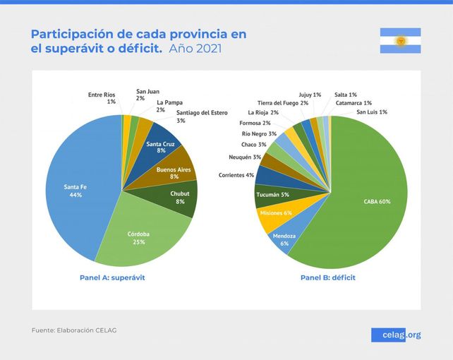 Santa Fe, con 12,1 mil millones de dólares de superávit es la provincia más superavitaria y duplica a la segunda, Córdoba, con 6,8 mil millones de dólares y sextuplica a las tres seguidoras, Chubut, Buenos Aires y Santa Cruz cuyos superávits se ubican en torno a los 2 mil millones de dólares.