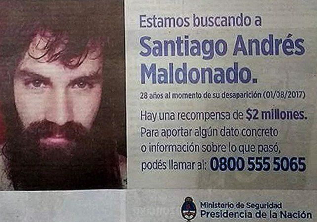 El ministerio de Seguridad de la Nación publicó hoy una solicitada en diarios nacionales, recordando la recompensa dispuesta para quien aporte datos sobre la aparición del joven Santiago Maldonado, visto por última vez tras un operativo realizado por la Gendarmería Nacional en la comunidad mapuche de Cushamen, en Chubut.