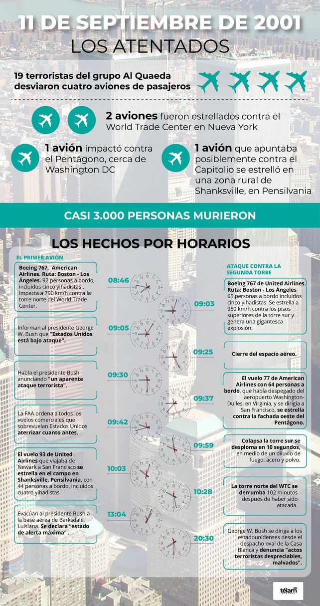 Cinco argentinos –un enfermero, un bombero y tres empresarios– murieron en los atentados del 11 de septiembre de 2001 (11-S) en Estados Unidos, que causaron alrededor de 3.000 muertos y marcaron un ante y un después para ese país y para el mundo entero.