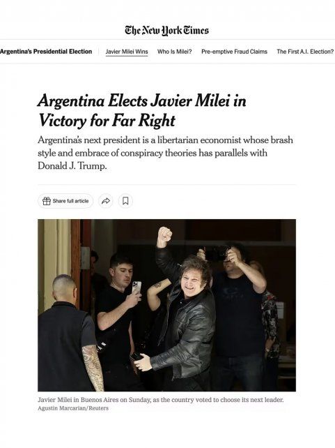 En tanto, el The New York Times dedicó espacio al resultado de la elección de este domingo. “El próximo presidente de Argentina es un economista libertario cuyo estilo descarado y su apego a las teorías de la conspiración guardan paralelismos con Donald J. Trump”, afirmó.