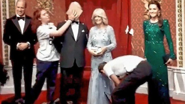 Este lunes, en el Día Internacional Contra el Cambio Climático, se trató de torta de chocolate y el objetivo fueron las representaciones de cera de los monarcas del Reino Unido.